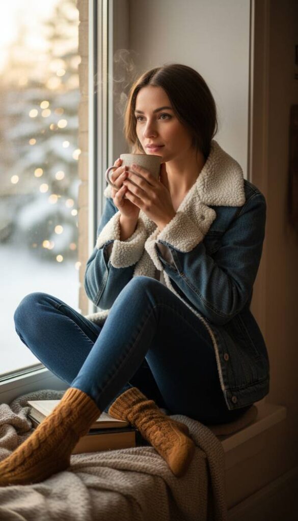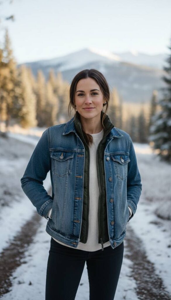 Feel the practical warmth of a lightweight puffer vest, perhaps in a deep olive green or rich burgundy, layered over a long sleeve thermal top and topped with a denim jacket. This ensemble is the epitome of smart cold weather layering, offering insulation without bulk. The vest’s subtle sheen provides a textural contrast to the matte denim. Imagine the crisp, cool air against your cheeks as you navigate outdoor activities, confident in your warmth and style. Pair with comfortable, durable jeans and sturdy waterproof boots for an outfit that is both functional and chic. The air smells invigorating, like frosty mornings. The lighting is clear and natural, highlighting the practical yet stylish layering.