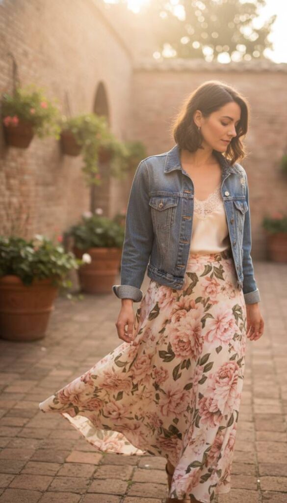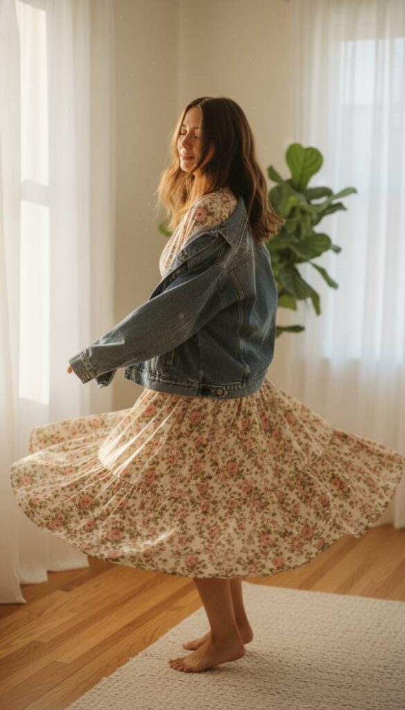 Imagine a delicate, flowing midi dress adorned with a vibrant yet understated floral pattern, its soft fabric brushing gently against the legs with every step. Over this, a classic, slightly oversized denim jacket provides a perfect balance of structure and casual ease. The contrast between the romanticism of the dress and the ruggedness of the denim creates a captivating visual narrative. Feel the airy lightness of the dress fabric beneath the substantial weight of the denim. Accessorize with strappy sandals or delicate ankle boots for a truly enchanting look. The air smells sweet, like spring blossoms, even amidst winter’s chill. Soft, ethereal light streams in, highlighting the movement of the dress.