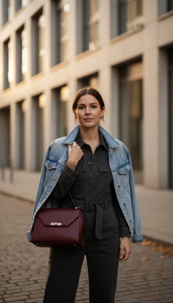 Picture a chic, utility inspired jumpsuit in a rich, dark color like black, navy, or deep khaki, its fabric soft yet structured, providing a contemporary foundation. Over this modern silhouette, a classic denim jacket, perhaps slightly oversized for an effortless vibe, adds a layer of casual cool. The jumpsuit’s clean lines are beautifully contrasted by the jacket’s rugged texture. Feel the comfortable ease of the jumpsuit’s drape combined with the familiar embrace of the denim. Accessorize with statement earrings and platform boots for an elevated urban aesthetic. The air carries a subtle hint of modern city life. The lighting is cool and sophisticated, with subtle shadows.