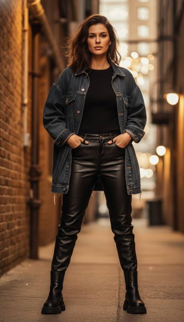 Envision the sleek, confident gleam of matte black faux leather pants, their smooth surface reflecting ambient light, paired with a dark wash, slightly oversized denim jacket. The juxtaposition of the rugged denim and the edgy leather creates a dynamic, fashion forward statement. Beneath the jacket, a simple black ribbed top or a band tee maintains the cool, urban aesthetic. Feel the cool, smooth texture of the leather against your skin, contrasted by the familiar, sturdy denim. This look is perfect for an evening out or a concert, exuding an air of understated rebellion. The air carries a hint of a smoky, rich perfume. The lighting is dramatic and low key, with sharp highlights.