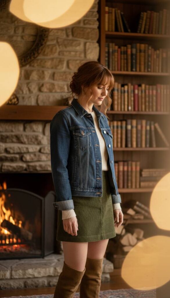 Visualize a rich, earthy toned corduroy mini skirt—perhaps in deep rust, olive green, or warm brown—its fine ridges offering a delightful tactile texture. This is paired with a classic indigo denim jacket, which grounds the rustic charm of the corduroy with its familiar, sturdy presence. Beneath the jacket, a ribbed knit sweater or a simple long sleeve tee in a neutral shade completes the cozy aesthetic. Feel the soft, slightly velvety nap of the corduroy, a comforting warmth against the skin. Tall, over the knee suede boots would elevate this look, perfect for a weekend getaway to a cabin or a stroll through a farmers market. The air smells faintly of autumn leaves. The lighting is warm and natural, suggesting a golden afternoon.