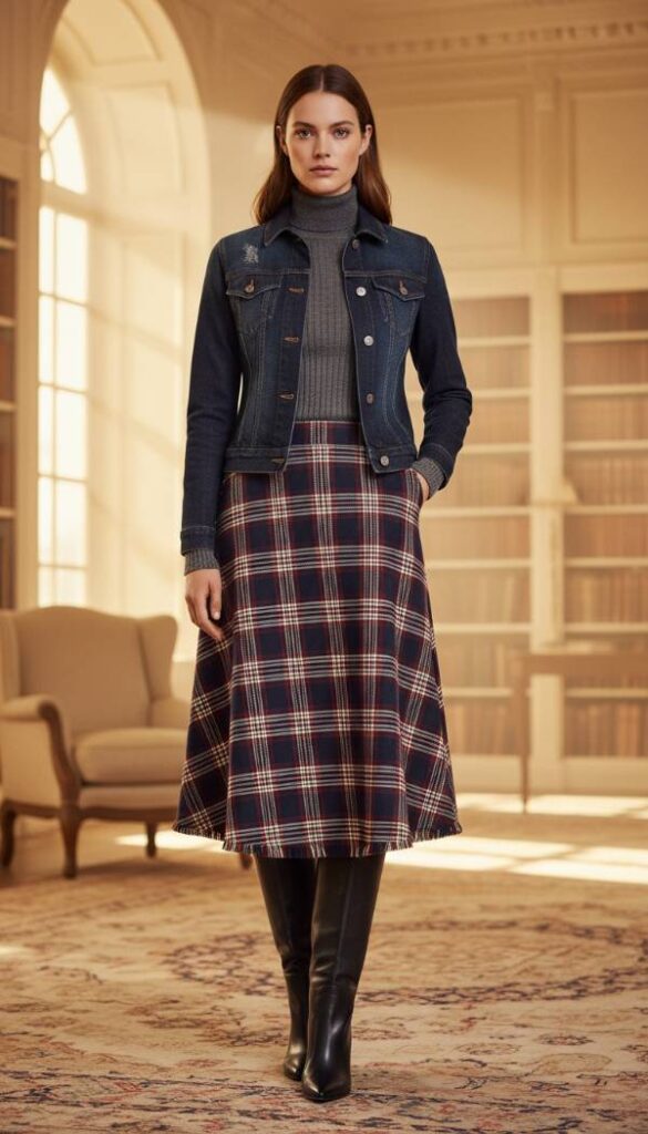 Envision an elegant a line skirt in a luxurious fabric like brushed wool or heavy tweed, perhaps in a timeless plaid or a solid jewel tone, falling gracefully to just below the knee. Paired with a fitted, dark wash denim jacket, this outfit strikes a sophisticated balance between casual and refined. Beneath the jacket, a fine gauge merino wool sweater adds warmth and polish. Feel the rich texture of the skirt’s fabric, a stark contrast to the familiar, robust denim. Tall, sleek leather boots, perhaps in black or deep brown, complete this polished winter look, perfect for any elevated daytime occasion. The lighting is soft and even, suggesting a refined indoor setting.