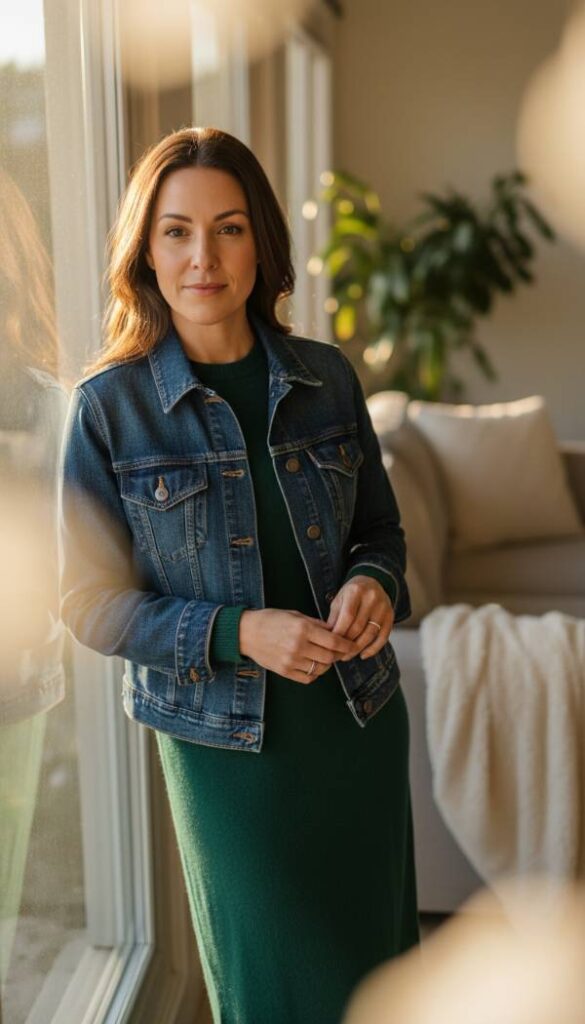 Imagine the soft brushed cotton of a perfectly aged denim jacket, its faded indigo hue whispering tales of seasons past. Beneath its sturdy embrace, a finely knit midi dress, perhaps in a deep forest green or rich burgundy, drapes gracefully, its soft yarn offering comforting warmth against the crisp air. This pairing creates a delightful interplay of textures—the rugged denim juxtaposed with the smooth, flowing knit. Accessorize with supple leather ankle boots and a delicately woven scarf, allowing the fabrics to meld into a harmonious symphony. The air carries a faint scent of woodsmoke, enhancing the cozy aesthetic, while diffused light filters through a window, illuminating the subtle sheen of the knitwear.