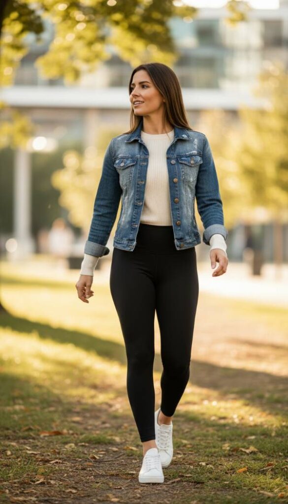 Feel the comfort of high waisted, matte black athletic leggings, their fabric gently sculpting the form, paired with a simple long sleeve tee and a well fitting denim jacket. The jacket provides a structured counterpoint to the soft, flexible leggings, creating a balanced silhouette. Imagine the quiet bounce of her step as she moves, embracing both athleticism and style. Sleek, minimalist sneakers, perhaps in white or a muted pastel, complete this active yet polished ensemble. The air feels fresh and invigorating, as if after a light morning jog. This look is perfect for errands, casual meet ups, or a brisk walk. Soft, even light illuminates the scene, emphasizing ease of movement.