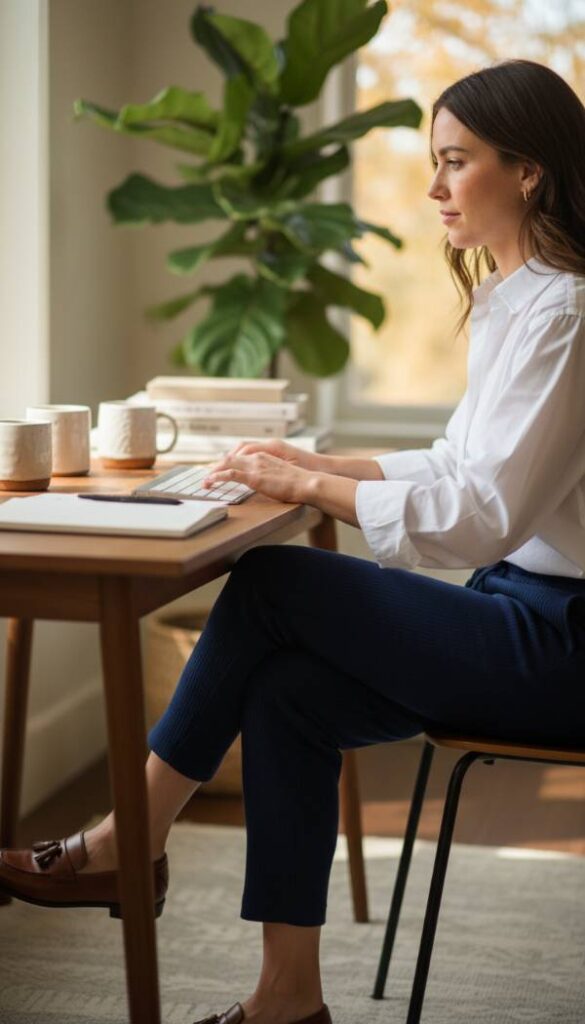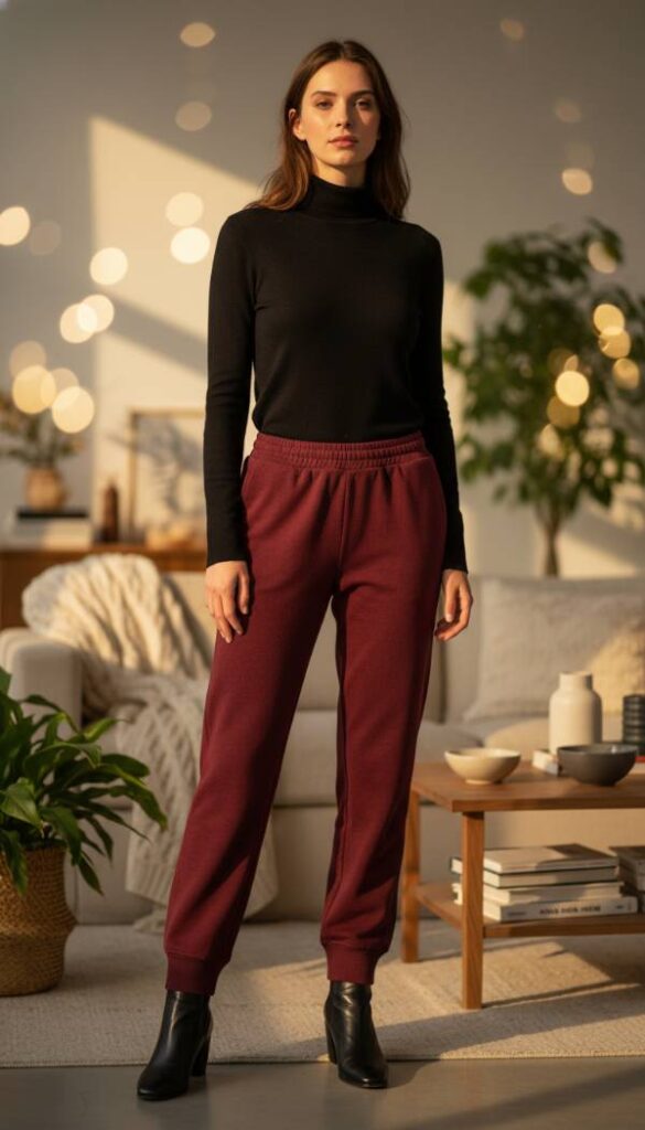 Elevate your loungewear with a unique sweatpant featuring a prominent front seam detail, crafted from a luxurious modal blend in a deep plum. The seam adds a structural element, creating a flattering, elongated line down the leg. The fabric feels exceptionally smooth and silky against the skin, offering a breathable yet warm embrace. Paired with a fitted scoop neck top and soft ballet flats, this outfit combines innovative design with supreme comfort.