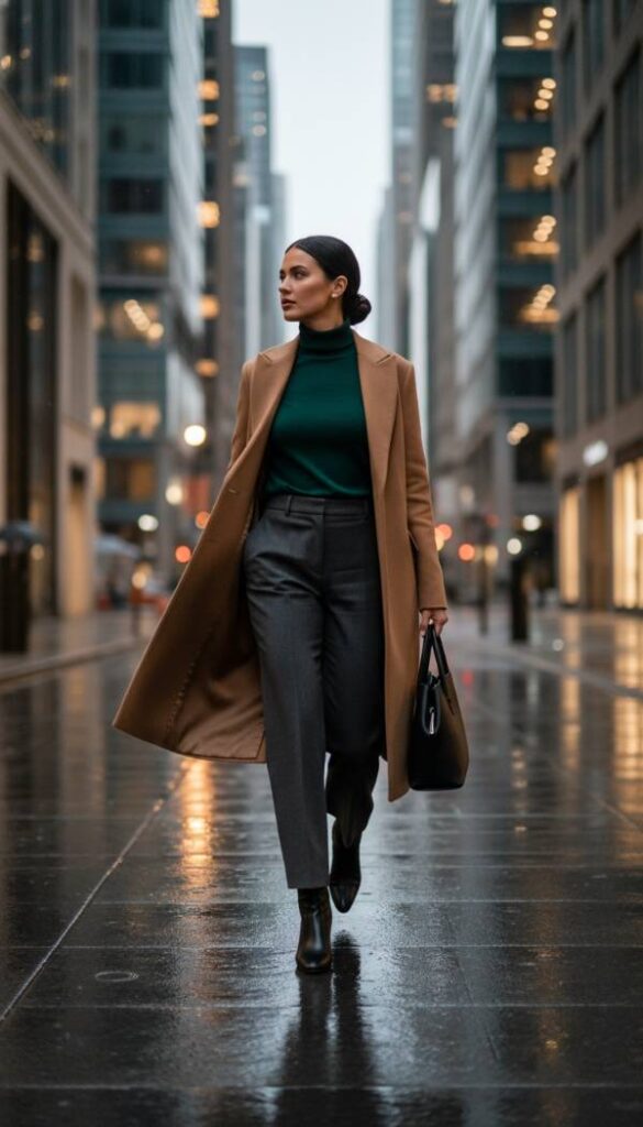 This sophisticated look reimagines professional attire with a contemporary edge. A meticulously tailored charcoal wool trouser, featuring a subtle wide leg silhouette, pairs effortlessly with a high gauge cashmere turtleneck in a deep forest green. Layer a streamlined, longline camel coat over the ensemble for an added touch of refined elegance. The crucial element is a pair of sleek, polished black leather work boots with a slender profile, lending an unexpected grounded finish. This outfit projects an aura of commanding confidence and sartorial intelligence, perfect for the modern executive navigating urban landscapes with grace.