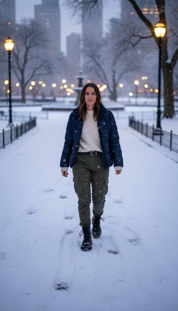 Embrace the functional aesthetics of gorpcore with a luxurious twist for your winter work ensemble. Start with olive green technical cargo pants, featuring discreet pockets and a relaxed fit that tapers at the ankle. Pair these with an oversized, chunky cable knit sweater in an oat milk hue, providing cozy contrast and texture. A high performance, insulated puffer jacket in a deep navy offers essential warmth without compromising style. Anchor this look with robust, treaded black leather work boots that provide both exceptional grip and a fashion forward statement. This ensemble perfectly balances rugged durability with high end comfort for sophisticated winter exploration.