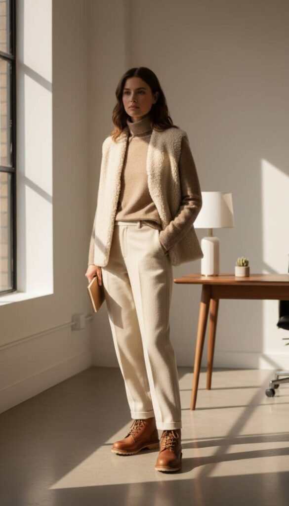 This ensemble epitomizes understated elegance through superior quality and thoughtful design, perfect for the discerning professional. Begin with perfectly tailored cream colored wool trousers that offer a refined, comfortable fit and a versatile base. Layer a luxurious cashmere blend sweater in a soft taupe, exuding warmth and subtle opulence that speaks volumes. Over this, don a well structured, minimalist shearling vest in a complementary neutral tone, adding texture and warmth without unnecessary bulk. The look culminates with refined, burnished brown leather work boots, impeccably crafted and designed for lasting appeal. This outfit speaks volumes through its quiet assurance and high end materials, ideal for winter.