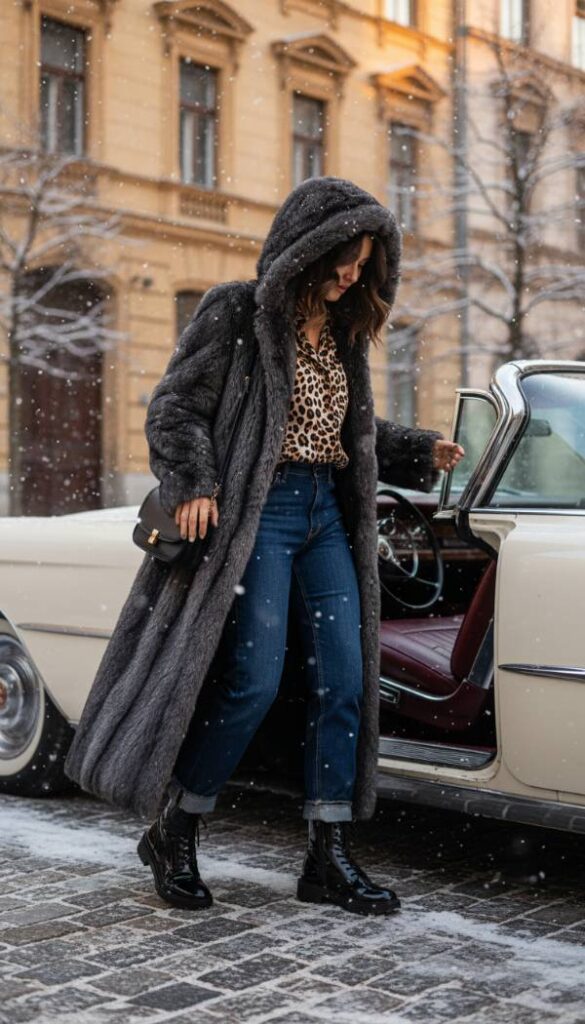 Channel an unapologetic sense of dramatic luxury with this mob wife inspired ensemble, perfectly adapted for colder temperatures. Begin with a form fitting, dark wash straight leg jean that offers a flattering silhouette and a solid base. Layer a lustrous, animal print silk blouse beneath a voluminous, floor length faux fur coat in a rich, dark hue, providing ultimate warmth and glamour. Accessorize with oversized gold hoop earrings and a structured leather handbag. The unexpected grounding element is a pair of polished, patent leather combat boots, adding an edge of audacious power to the extravagant look. This combination exudes a confident, bold, and intrinsically glamorous aesthetic for winter.