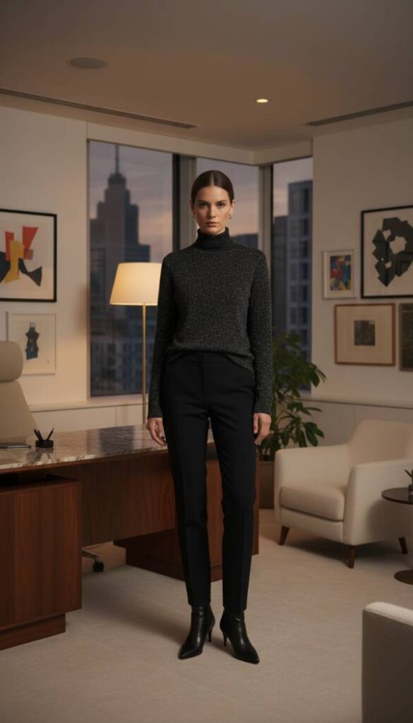 Inject a hint of festive glamour into your everyday winter workwear with a subtle metallic accent, ideal for sophisticated charm. Build your foundation with tailored black trousers and a classic black turtleneck, creating a streamlined and versatile base. The elegant twist comes from a fine gauge knit sweater or cardigan interwoven with delicate metallic thread (gold or silver), providing a sophisticated shimmer without being overtly flashy. This allows for an understated yet captivating play of light. Complete the look with sleek, black leather work boots featuring minimalist hardware details, ensuring practicality meets polished style for any festive or daily occasion during the colder months.