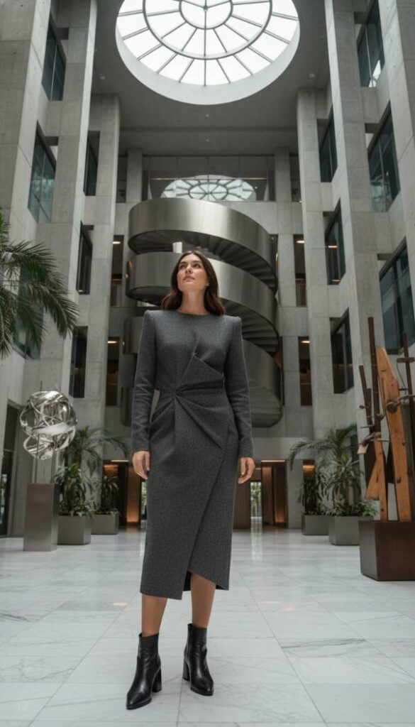 Achieve striking sophistication through clean lines and impeccable structure, embodying true minimalist chic for the winter season. Choose a sculptural wool midi dress in a deep charcoal or obsidian black, featuring a high neck and precise tailoring that creates an artful silhouette. The beauty lies in its simplicity and form, allowing the wearer to shine. Accessorize minimally with subtle silver jewelry, enhancing the understated elegance. The crucial grounding element is a pair of smooth, unadorned black leather ankle boots with a robust, yet sleek sole. This outfit embodies a minimalist yet powerful aesthetic, celebrating strong design and an understated approach to elegance for the contemporary woman.