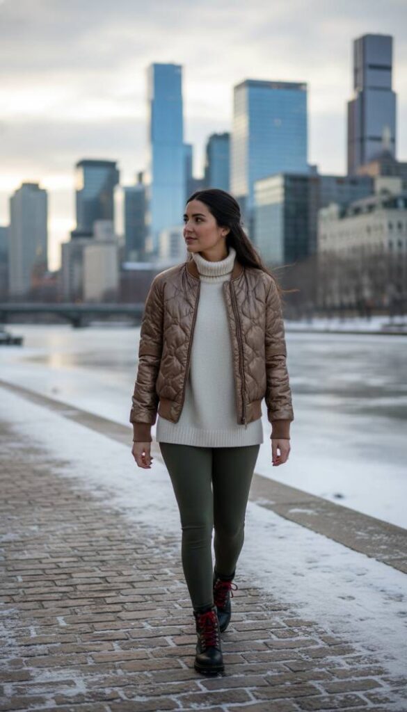 This look blends rugged utility with sleek city style, perfect for the adventurous urbanite navigating winter conditions. Begin with high waisted, durable stretch leggings in a deep olive green, offering both comfort and flexibility for active days. Pair these with a technical, heat retaining base layer and a finely knit merino wool sweater for optimal warmth. Top it all with a chic, quilted bomber jacket in a contrasting metallic bronze or dark silver, adding an unexpected sheen and contemporary edge. Complete the ensemble with robust, hiking inspired black leather work boots, ensuring both style and readiness for city treks and varied terrains.