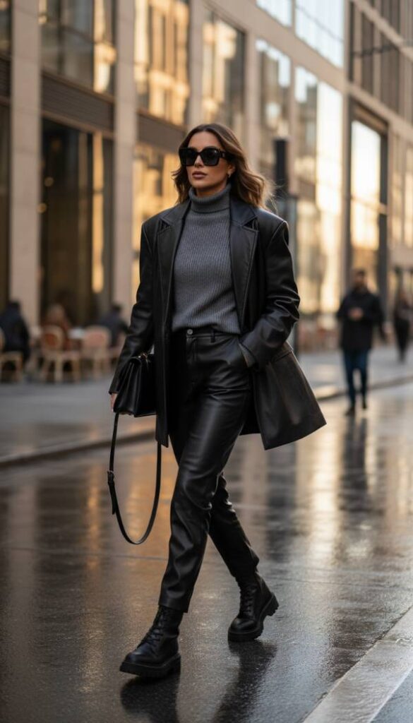 Embrace the edgy sophistication of a leather on leather aesthetic with a refined touch, perfect for a powerful winter wardrobe. Select buttery soft, high waisted leather trousers in a classic black or deep burgundy, offering both warmth and a sleek silhouette. Pair these with a lightweight, high neck knit sweater in a contrasting texture, like a fine ribbed cashmere, for nuanced interest. Top it with a meticulously tailored, oversized leather blazer, creating a sleek and powerful silhouette that exudes confidence. This bold yet chic ensemble is grounded by a pair of chunky, combat inspired black leather work boots, adding a rugged edge to the luxurious materials. This is an ideal outfit for making a statement.