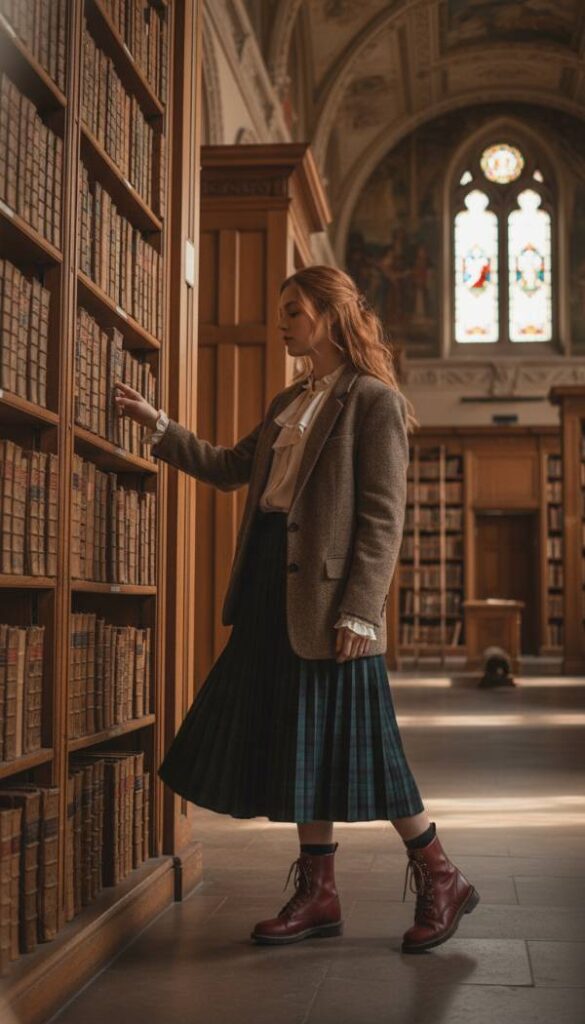 Reimagine the classic academic aesthetic with a touch of modern sophistication, perfect for the intellectual seeking style. Select a rich, dark plaid pleated midi skirt that offers elegant movement and a nod to traditional patterns. Pair this with a high neck, ruffled silk blouse in a deep cream, adding a hint of romanticism and softness. Layer a tailored, oversized tweed blazer in earthy tones over the blouse, exuding intellectual charm and warmth. Complete the scholarly yet stylish look with classic, burnished oxblood leather work boots, providing a sturdy and authentic foundation. This outfit is perfect for thoughtful reflection and intellectual pursuits in sophisticated settings.