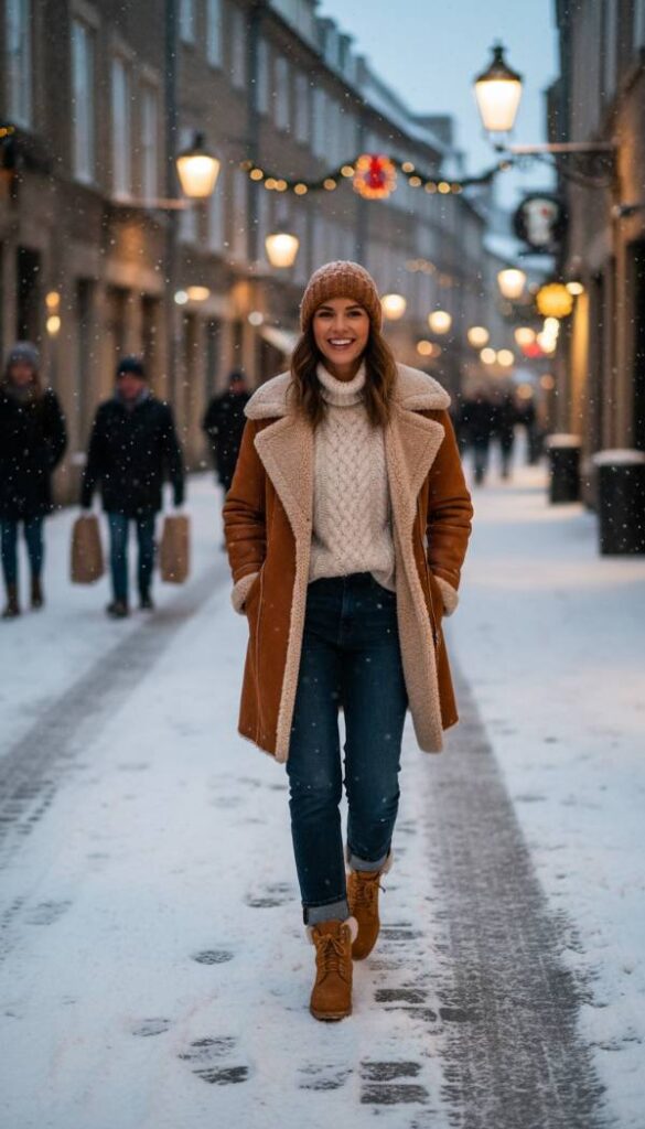 Elevate your winter outerwear with the plush warmth and undeniable style of shearling, creating a truly luxurious look. Start with dark wash, straight leg denim or slim fit black wool trousers for a solid base that grounds the outfit. Layer a soft, fine gauge knit sweater in a neutral tone like cream or grey for comfortable warmth. The star of the show is an oversized, sumptuously soft shearling lined coat or jacket in a rich caramel or chocolate brown, providing luxurious texture and unparalleled comfort. Anchor this opulent yet practical look with sturdy, light brown suede work boots featuring a shearling trim, blending seamlessly. It is an ideal fusion of comfort and sophistication.